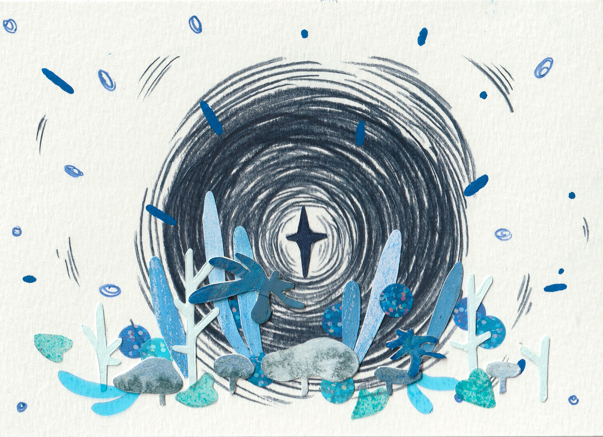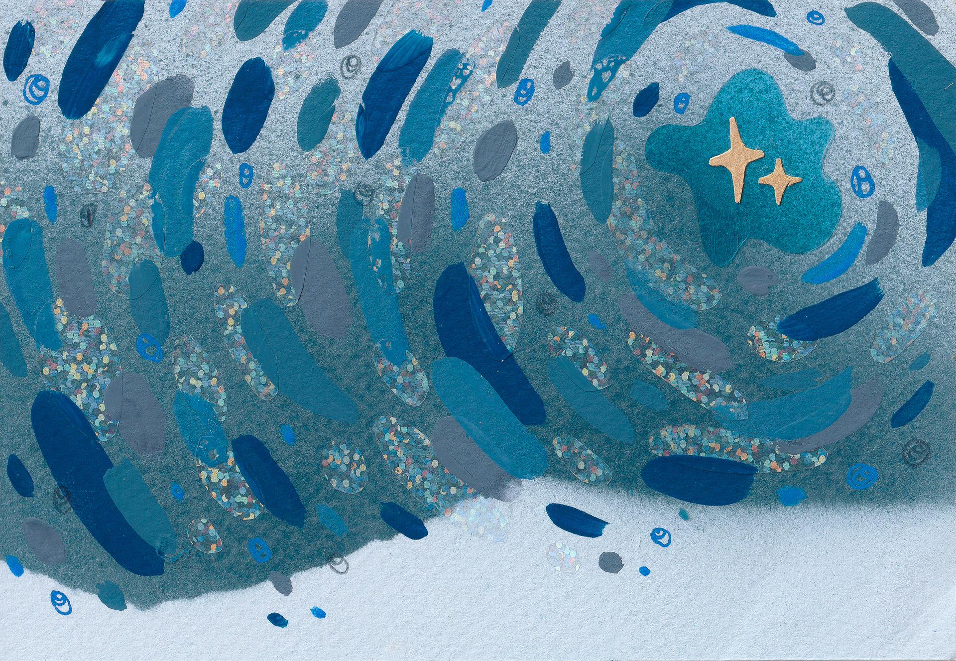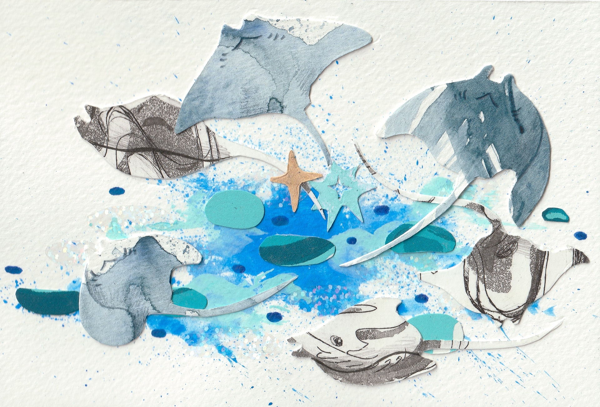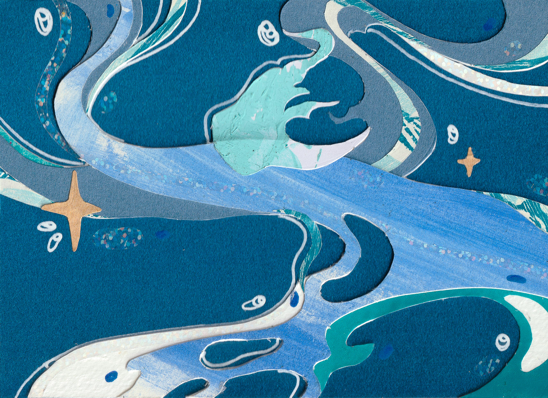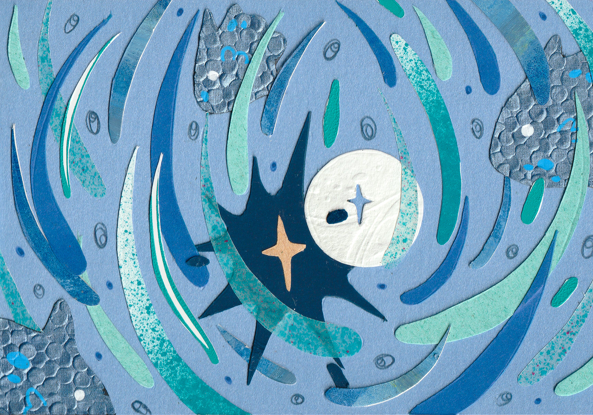 una mirada al fondo del mar is a series of six collage art pieces made with watercolor, screen printing, metal printing, gouache, and colography. This is one of the pieces made for my first invididual exhibition, each tells a small part of a story I developed for the exhibition. 2025.